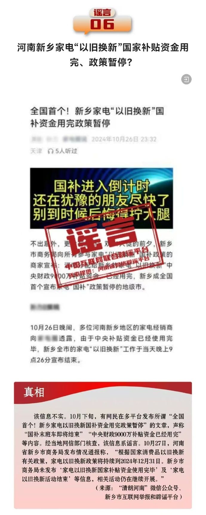 打擊網(wǎng)絡謠言 共建清朗家園 中國互聯(lián)網(wǎng)聯(lián)合辟謠平臺2024年10月辟謠榜